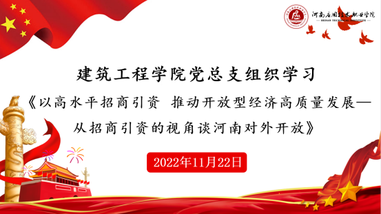2022年11月22日下午,建筑工程公司党总支组织全体教师在办公楼516党员活动室学习“十大战略”系列课程之《以高水平招商引资 推动开放型经济高质量发展—从招商引资的视角谈河南对外开放》,本次学习采取东西校区视频连线,线上、线下相结合的方式,会议由建筑工程公司党总支书记马春燕主持,经理张虎及全体教职工参加会议。