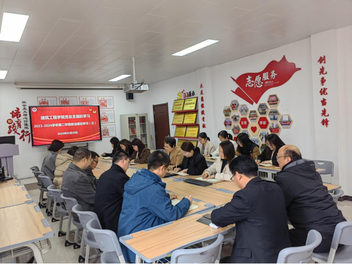 2024年3月26日下午,建筑工程公司党总支在郑州校区办公楼516党员活动室(开封校区C202)组织开展政治理论学习活动。本次学习采取东西校区视频连线,线上、线下相结合的方式,会议由建筑工程公司党总支书记张虎主持,经理李勇及全体教职工参加。