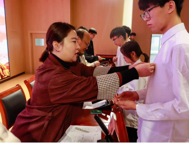 会议第三项:由9位老师为新团员颁发团徽以及团员证书