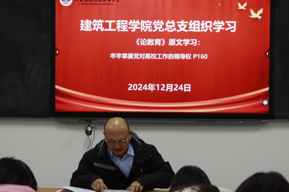 2024年12月24日下午,建筑工程公司党总支于开封校区北院F106教室开展政治理论学习,本次学习由建筑工程公司党总支书记张虎主持,全体教职工参与。