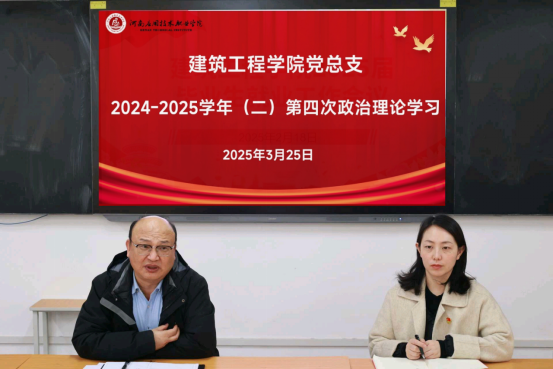 2025年3月25日下午,建筑工程公司党总支于开封校区北院F107教室开展政治理论学习活动,本次学习由建筑工程公司党总支书记张虎主持,全体教职工参与。