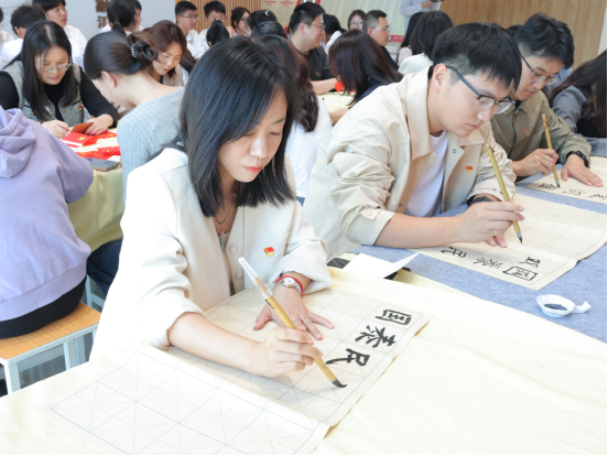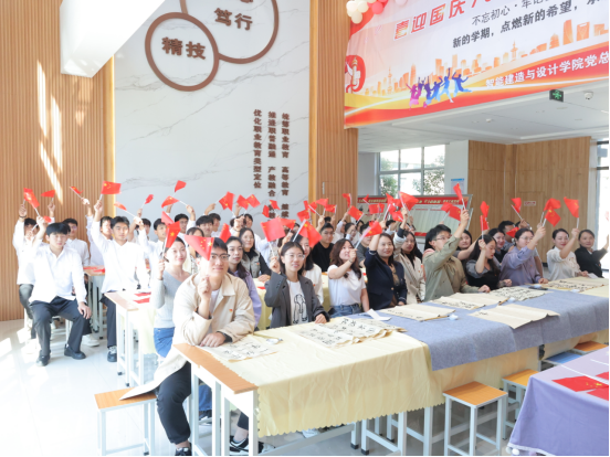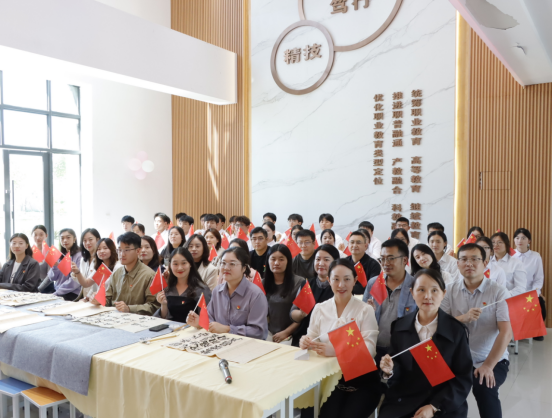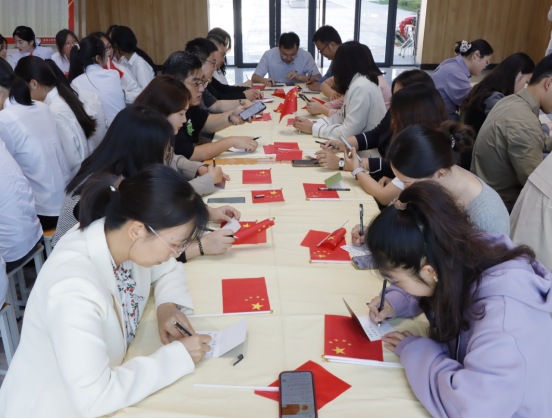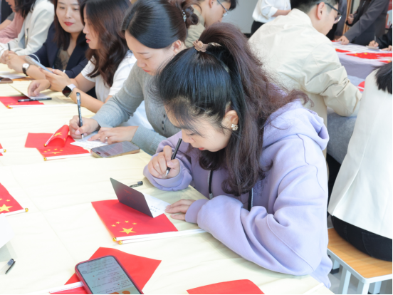 在“一封家书寄相思”书信环节,党员教师们提笔伏案,将双节感悟、工作心得与党员担当融入文字,或向家人诉说牵挂祝福,或分享身为党员的责任坚守,字里行间尽显“爱国爱家相统一”的赤诚。活动中,部分党员教师朗读家书片段,真挚的情感引发全场共鸣,生动诠释了共产党员“舍小家为大家”的奉献精神。“书法大赛——向祖国表白”环节现场墨香四溢。党员教师将党建金句、爱国诗句及节日祝福跃然纸上。一幅幅笔力遒劲的书法作品,既是对中华优秀传统文化的传承,更是对祖国母亲的深情告白。在“歌唱快闪——礼赞祖国”环节,全体党员教师和员工代表挥舞国旗齐声合唱《我和我的祖国》《歌唱祖国》《没有共产党就没有新中国》等经典曲目,将活动推向高潮。
