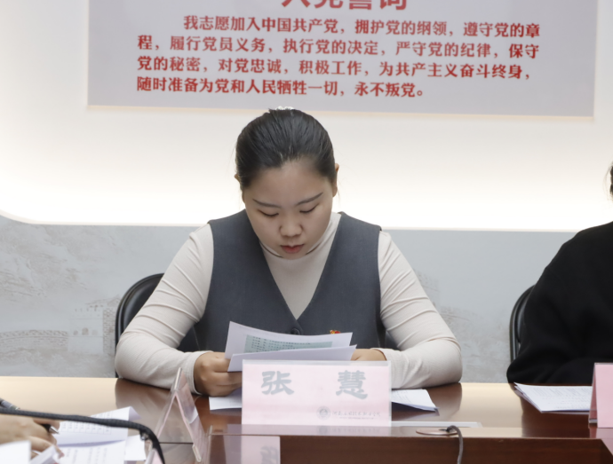 支部书记刘亚娟宣读支部决议,正式党员表决是否同意支部大会决议。