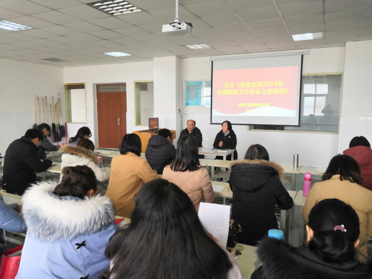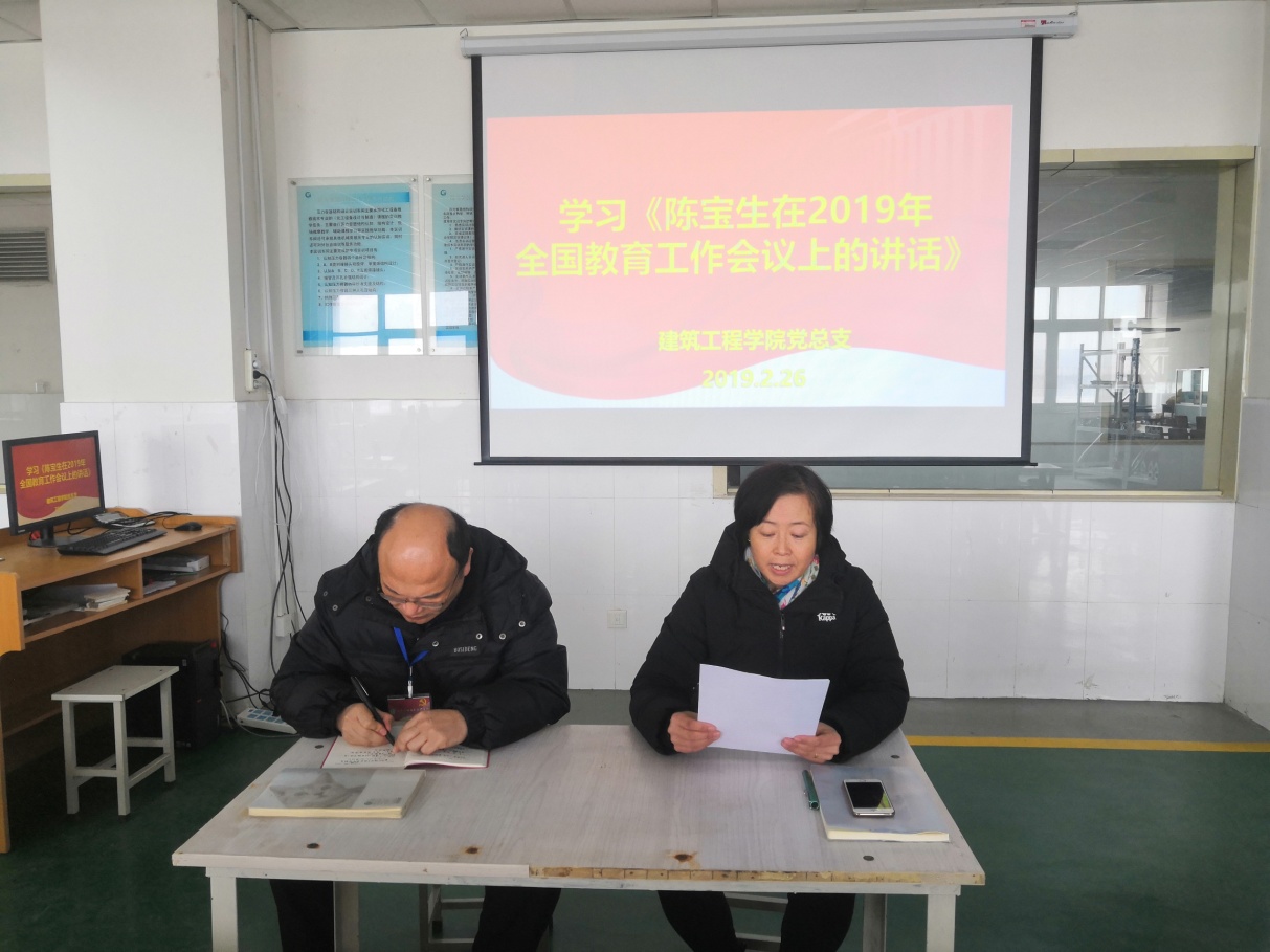 2019年2月26日下午,建筑工程公司党总支在E310,组织全体教职工学习教育部部长陈宝生,在2019年全国教育工作会议上的讲话,会议由党总支书记张虎主持。