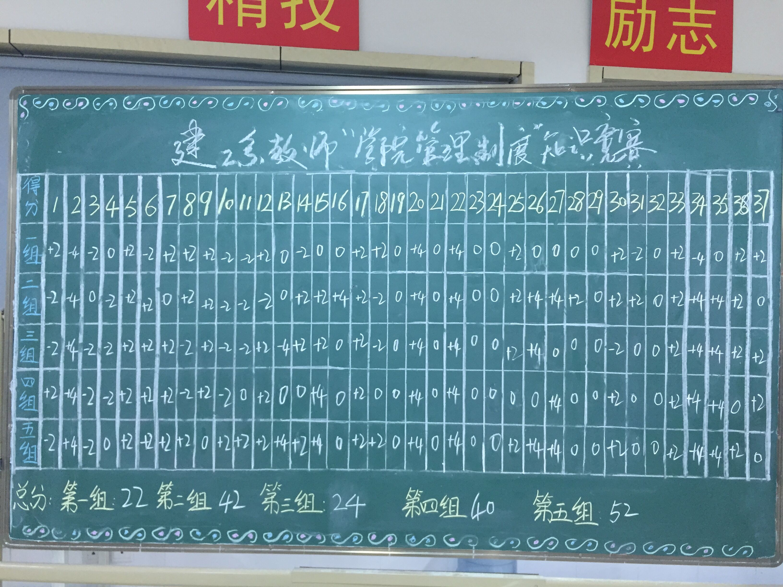 竞赛由常新中主任负责出题并组织抢答,马春燕书记负责考试监督,知识竞赛以十秒钟抢答的方式进行,本着全员参与、共同提高的原则,将系部教师分为五个小组,每组由三名教师组成。赛前各位教师精心准备,认真复习公司各项教师管理制度等相关文件。比赛中,小组成员之间认真讨论题目,快、准、狠的抢答每一道题目,将赛场的气氛营造的十分紧张,考虑到每位队员的配合程度和协调能力,成员间还不忘互相鼓励,即使落后了也不轻言放弃,魄力不得不让我们佩服。在历时一个小时38道题目的比赛中,心理素质上的考验,知识上的激烈角逐,丰富了广大教师的文化生活,使大家发现了自己的不足,及时为建工系的各项工作顺利开展铺平了道路。