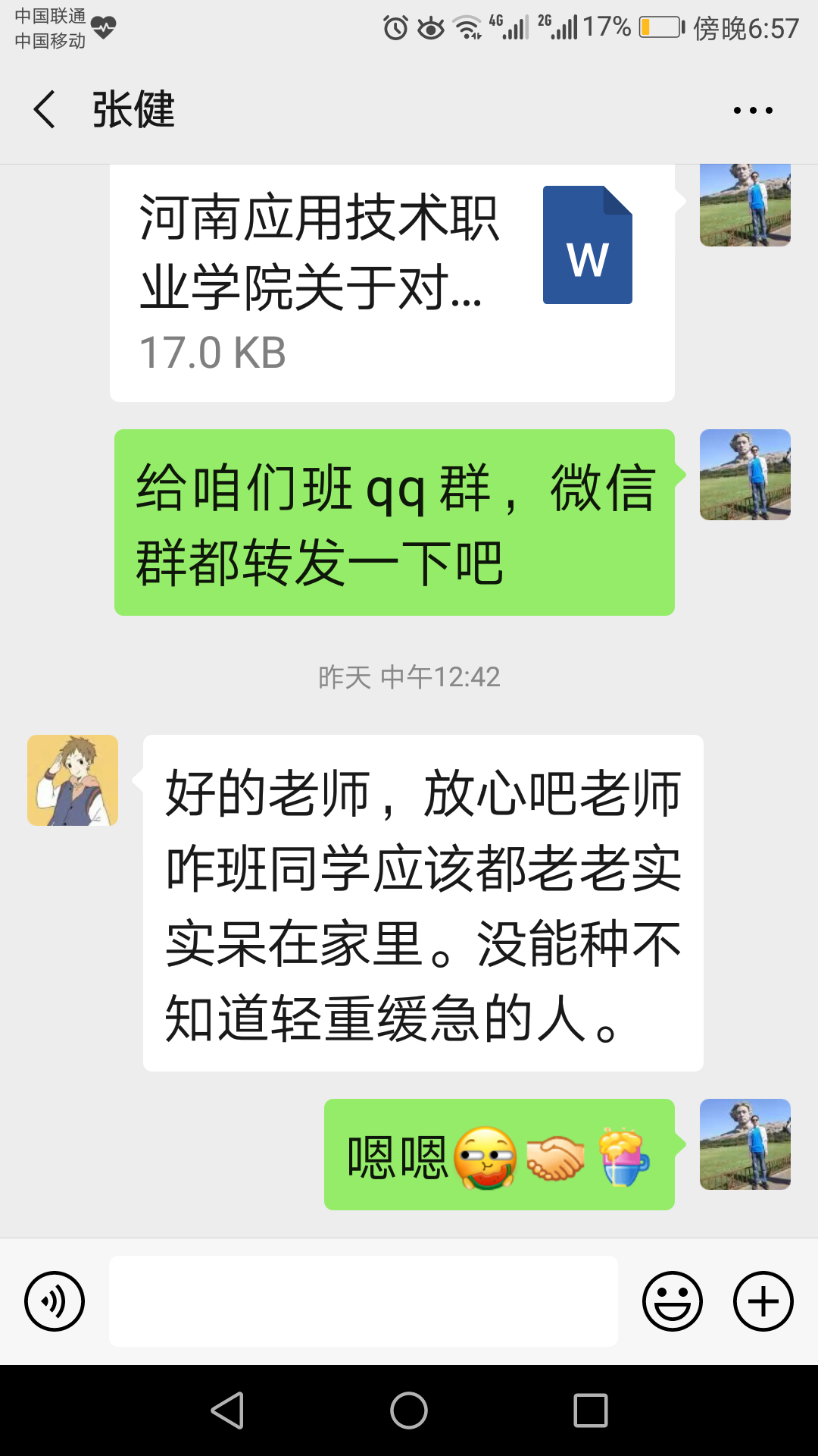 公司best365足球官网的辅导员们按照公司和马春燕书记的工作部署要求,勇担使命,竭尽所能,尽献微光。他们作为一线战“疫”员,忙碌在自己的工作岗位上,密切关注、关心员工近况。认真落实好“日报告、零报告”制度,建立了本班疫情防控员工信息台账,每日摸排员工状况、统计上报疫情数据、每日问候湖北员工、每日在班级群第一时间转发分享疫情变化和相关时事新闻,提醒班级同学做好疫情防护工作,对员工进行思想引导和心理疏导,与员工沟通缓解紧张情绪,与家长联系争取工作支持。对网上恶意传播和扭曲疫情信息所造成的恐慌等现象,积极发声,及时辟谣,教育同学们不信谣、不传谣,宣传合理的防疫措施,让员工认识到每个人都是自身健康的第一责任人,务必做好自我防护。