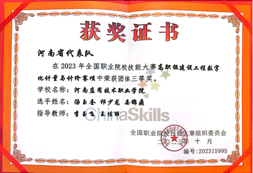 2023年10月28日,由教育部等36个部门主办的2023年全国职业院校技能大赛高职组“建设工程数字化计量与计价”赛项在青海建筑职业技术公司举行,来自全国32个省、市、自治区的76支代表队参与角逐,经过激烈比拼,公司best365足球官网员工汤玉奎、祁少龙、娄锦鼎组成的代表队荣获全国团体三等奖。