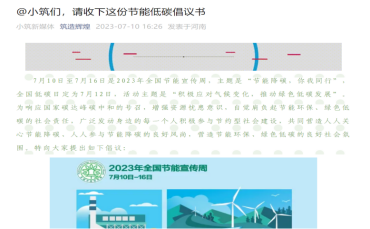 为响应国家碳达峰碳中和的号召,增强资源忧患意识,自觉肩负起节能环保、绿色低碳的社会责任,广泛发动身边的每一个人积极参与节约型社会建设,共同营造人人关心节能降碳、人人参与节能降碳的良好风尚,营造节能环保、绿色低碳的良好社会氛围,7月10日通过公司公众号“筑造辉煌”向全体师生发出“节能低碳”倡议书,并向全体师生发出“节能一小时”“我为节能减排贡献一份力量”等倡议。