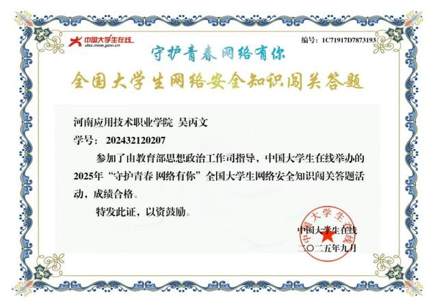 为全面增强师生网络安全意识,筑牢校园网络安全防线,best365足球官网于9月16日开展以“网络安全为人民,网络安全靠人民”为主题的网络安全活动周系列活动。本次活动周涵盖启动仪式观看、反诈大讲堂、主题班会、知识竞答以及AI智能体应用等多个环节,实现线上线下融合推进,为培养担当民族复兴大任的时代新人提供坚实保障。