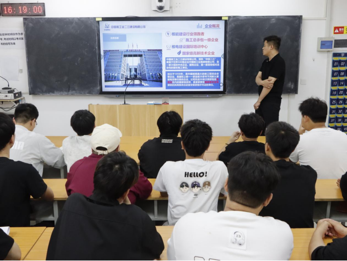 宣讲会上,中国核工业二三建设有限公司人力资源部负责人首先介绍了企业发展历程、业务布局及行业使命。作为我国核工业建设领域的骨干力量,公司深耕核电工程建设、核设施运维、新能源工程、工业与民用建筑等核心业务,参与了国内多个重大核电项目及新能源基地建设,具备全产业链服务能力与顶尖技术实力,其业务领域与公司智能建造、建筑设计等专业人才培养目标高度契合。负责人结合核电工程建设案例,讲解了智能建造技术在核工业领域的应用场景,以及行业高标准、严要求的发展特性,让员工直观认识核工业建设的重要意义与发展前景。