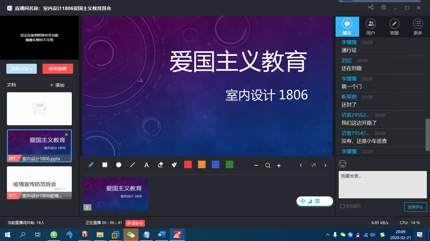通过两次主题班会的召开,让同学们在抗击疫情的同时,保持健康、乐观的心态,“宅”在家里忙着“充电”,等待春暖花开时节,精神饱满地投入到新学期火热的学习工作中去。在实践中认识国情、了解社会,以实实在在的行动投身到伟大的实践中,以真才实学服务人民,以创新创造贡献国家。