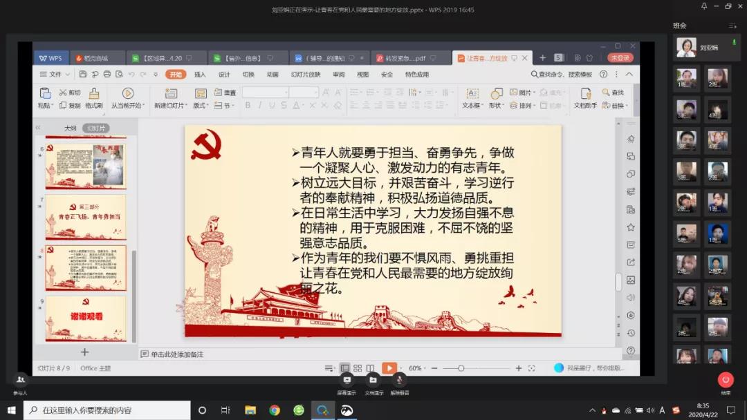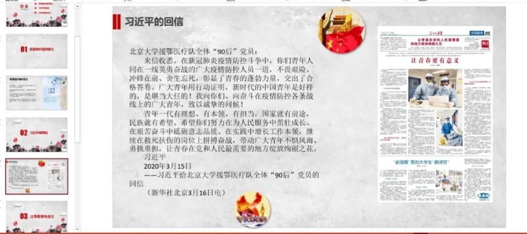 2020年4月20—24日,在best365足球官网团总支的组织下,各团支部积极学习“习近平回信勉励北京大学援鄂医疗队全体‘90后’党员——让青春在党和人民最需要的地方绽放”并以此为契机开展了网络青年团课集中学习。
