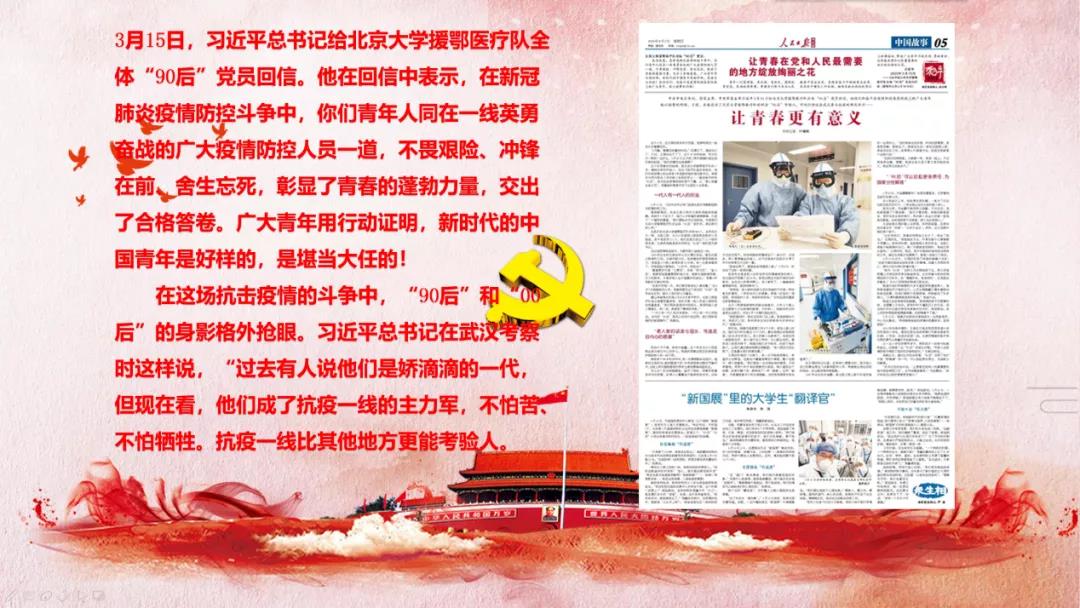 中共中央总书记、国家主席、中央军委主席习近平3月15日给北京大学援鄂医疗队全体“90后”党员回信,向他们和奋斗在疫情防控各条战线上的广大青年致以诚挚的问候。回信中,字里行间充满着对青年的深切期望、殷殷嘱托。在这次抗击疫情的斗争中,以“90后”为代表的青年一代挺身而出、担当奉献,充分展现了新时代中国青年的精神风貌。这不仅仅是写给北大援鄂医疗队的年轻英雄们,更是对我辈青年老员工、党员、团员的鼓励和期许。我们是新时代的弄潮儿,既脚踏实地,又敢闯敢拼,在这场没有硝烟的战役中,我们接受党和国家对我们的考验,学习前辈“干惊天动地事,做隐姓埋名人”奉献精神,用青春之我、青春之力、青春之声,掀起红色生命的浪潮。