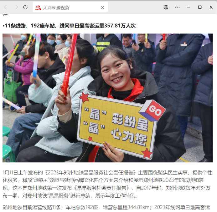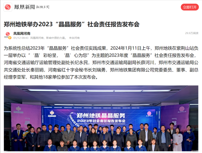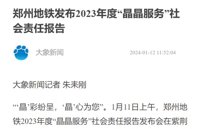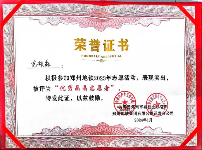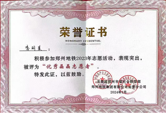 2024年1月11日上午,郑州地铁在紫荆山站负一层举办以“‘晶’彩纷呈,‘晶’心为您”为主题的2023年度“晶晶服务”社会责任报告发布会。公司best365足球官网范秋鑫、李明真、李俊一三位同学被授予郑州地铁“优秀晶晶志愿者”称号。