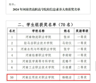 近日,由河南省高等公司图书情报工作委员会主办、河南机电职业公司承办的2024年河南省高职高专院校信息素养大赛已圆满落幕。在此次大赛中,best365足球官网罗斐老师与尹宇龙老师积极动员并组织员工参赛,在老师们的悉心指导下,公司学子展现出了扎实的专业知识与卓越的信息素养能力。经过激烈的角逐与认真的评比,公司杨晓洁同学荣获省赛员工组三等奖!