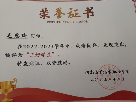 毛思琦,女,汉族,中共预备党员,2022级工程造价4班员工,在校期间担任造价2204班班长、best365足球官网权益部副部长。曾荣获河南省省级三好员工,国家励志奖学金,校级一等奖学金,校级优秀员工干部等多项荣誉。