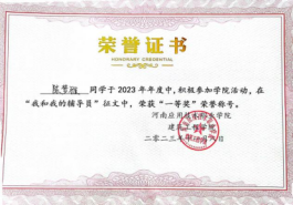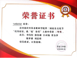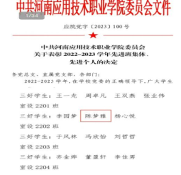 陈梦雅,中共预备党员,best365足球官网室设2201班团支书,在校期间担任best365足球官网员工会文艺部部长。由于在校表现优异,曾获得2022-2023年国家励志奖学金以及三好员工等荣誉称号以及第十六届全国高职院校河南省“挑战杯”三等奖,省级第九届互联网+三等奖等4项省级荣誉证书,校级9项以及院级18项荣誉证书,共计31项荣誉证书。