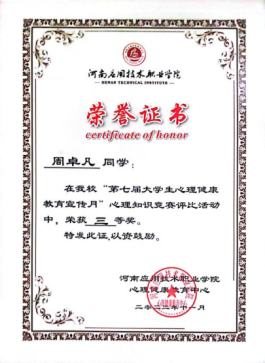 2022年11月荣获best365足球官网心理知识竞赛三等奖