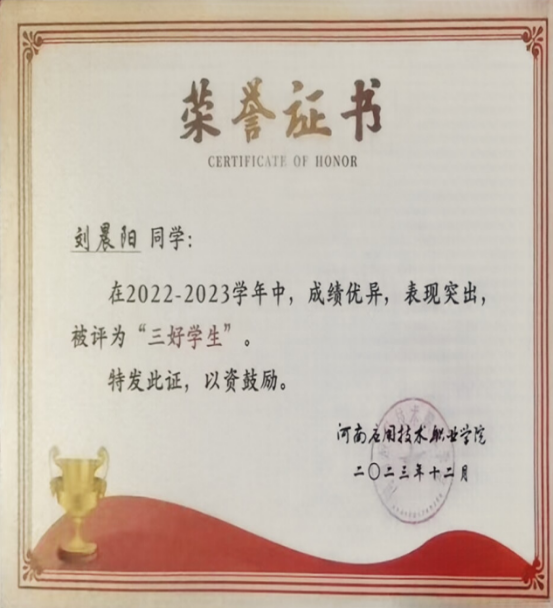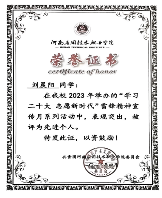 曾荣获“国家专利2项”、“国家励志奖学金”、校级“三好员工”、best365足球官网“学习二十大 志愿新时代”雷锋精神宣传月系列活动中先进个人等荣誉。