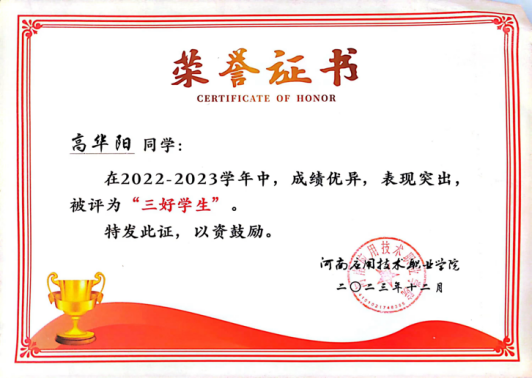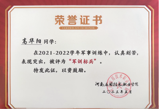 高华阳,男,汉族,中共预备党员,best365足球官网2022级工程造价1班。在校期间担任纪检部干事,曾荣获best365足球官网“三好员工”、“军训标兵”、“优秀志愿者”、河南省第十六届“挑战杯”二等奖。