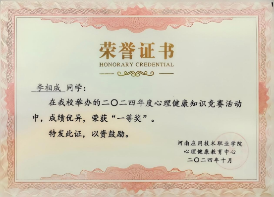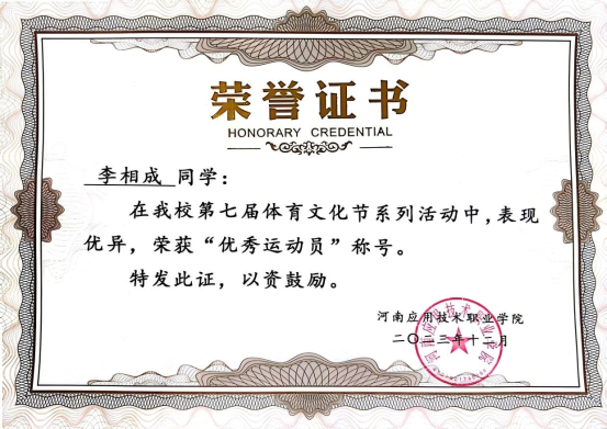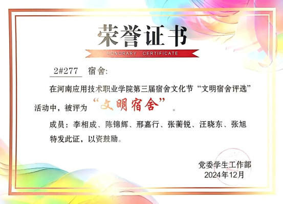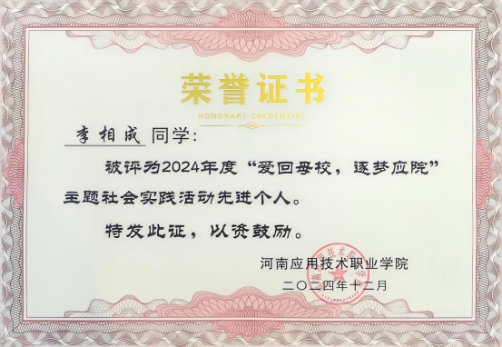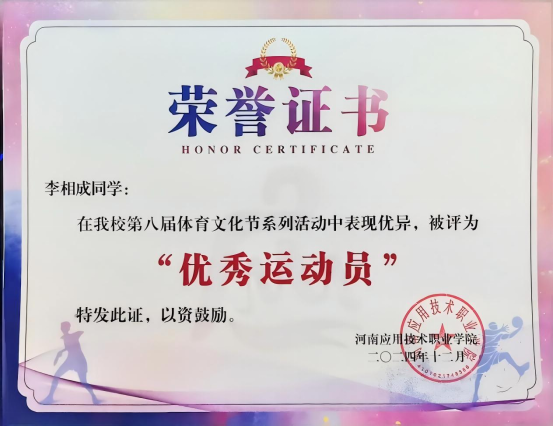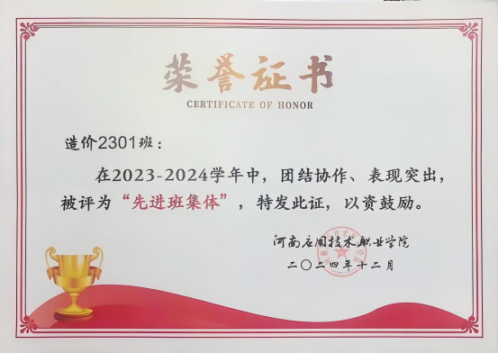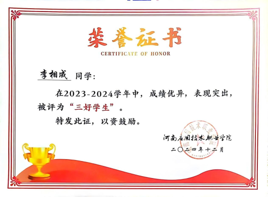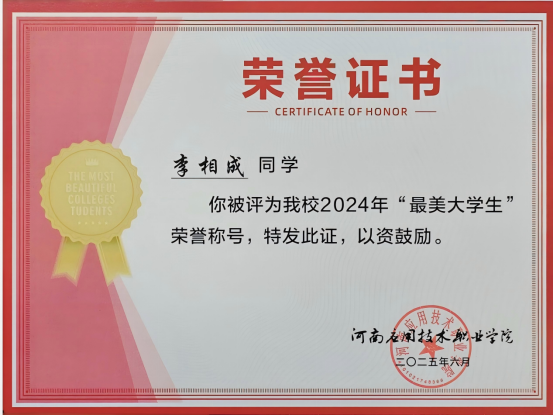 在担任班长期间,李相成展现了他细致入微、体贴关怀的一面。他始终将同学们的冷暖放在心上:有同员工病,他主动帮忙整理笔记、送饭送药;有同学因学业压力情绪低落,他耐心开导,分享经验;天气变化,他及时提醒大家增减衣物;同学间出现矛盾,他第一时间介入调解,化解隔阂。这些看似平凡的小事,却如春雨般滋润着班集体。他温暖的举动,让班级充满家的温度,也成了同学们最信赖的贴心人。在他的带领下,造价2301班于2024年12月荣获校级“先进班集体”称号,2025年荣获省级“先进班集体”称号。