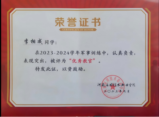 作为一名退伍军人,李相成积极响应公司号召,参与新生军训工作,并担任教导大队队长。这一角色是责任的延续,也是军人本色的传承。他将部队的优良作风和严格标准融入军训的每一个环节:从队列训练到内务整理,从纪律要求到思想教育,他都亲力亲为,一丝不苟。他不仅传授军事技能,更用亲身经历向新生们阐释军人精神的内涵,引导他们树立正确价值观,培养他们的纪律意识和吃苦耐劳的精神。因其出色的表现,他在2023—2024年被评为“优秀教官”。