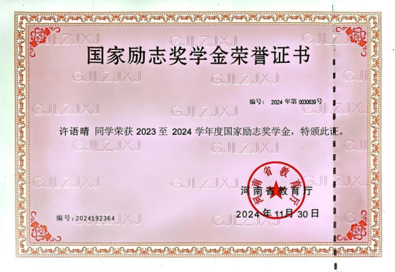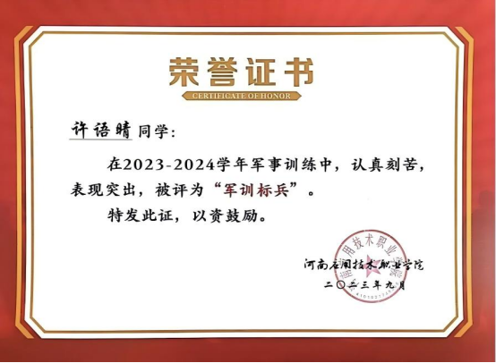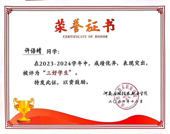 许语晴,女,汉族,河南郑州人,中共预备党员,best365足球官网建筑室内设计2304班员工,辅导员尹宇龙。连续两学年综合成绩班级第一,在校期间积极参与社会实践活动与校园文化活动,曾获得国家励志奖学金、全国高职院校“发明杯”老员工专利创新大赛、河南省创新创业大赛二、三等奖、三好员工等多项荣誉。
