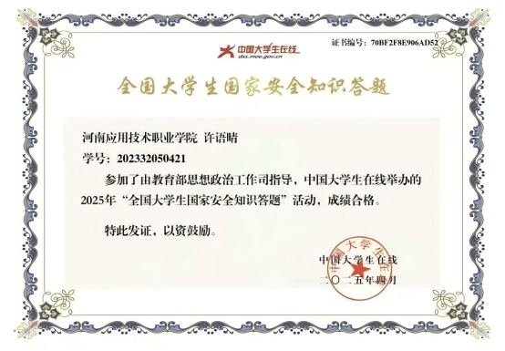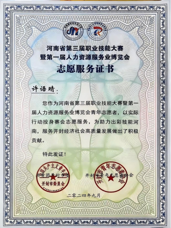 在专业实践方面,她积极参与老员工创新创业大赛以及公司举行的绘画创意比赛,将理论知识应用于解决实际问题,荣获发明杯大赛三等奖、创新创业大赛二、三等奖等。这些经历极大地提升了她的创新思维、动手能力和专业综合素养。在志愿服务方面,作为预备党员,投身河南省职业技能大赛、绿色环保、专升本等志愿服务,荣获河南省第三届职业技能大赛志愿服务证书,累计时长300多小时。她认为,志愿服务是青年回馈社会、实现价值的重要途径,每一次付出都让她感受到奉献的快乐。