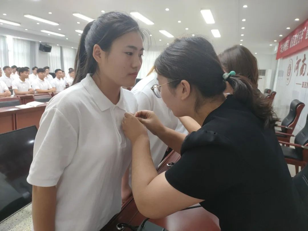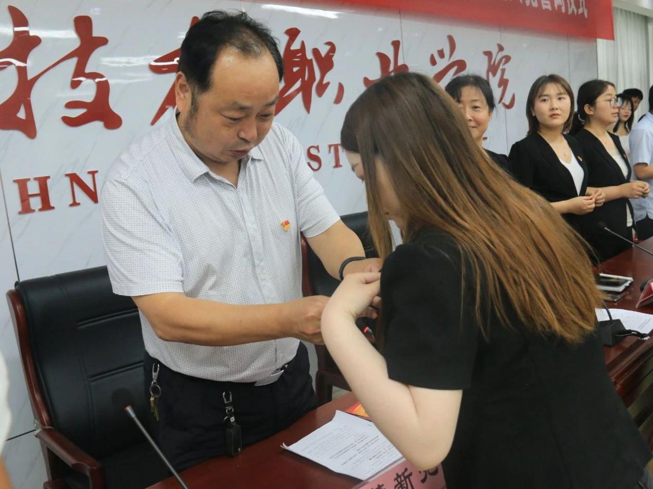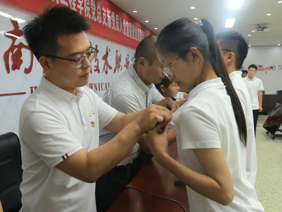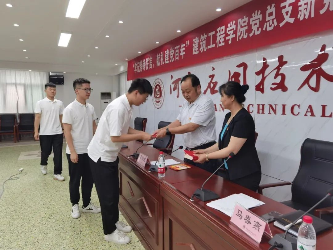 会议进行第二项,公司党委委员薄新党带领老党员们为新党员佩戴党员徽章,并为新党员发放《中国共产党章程》。