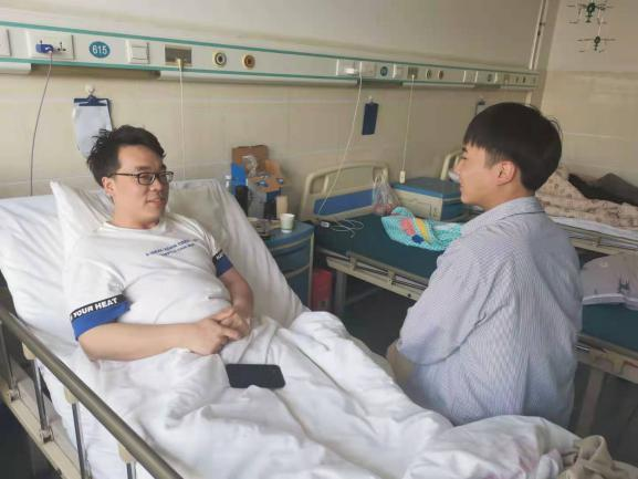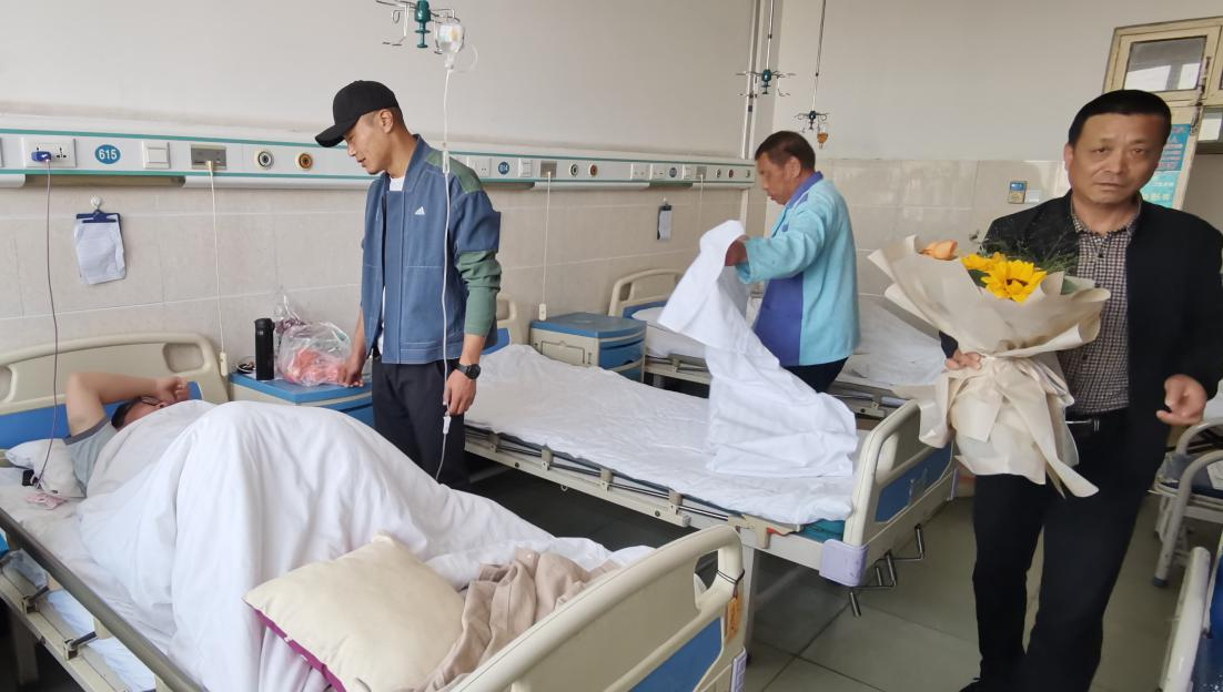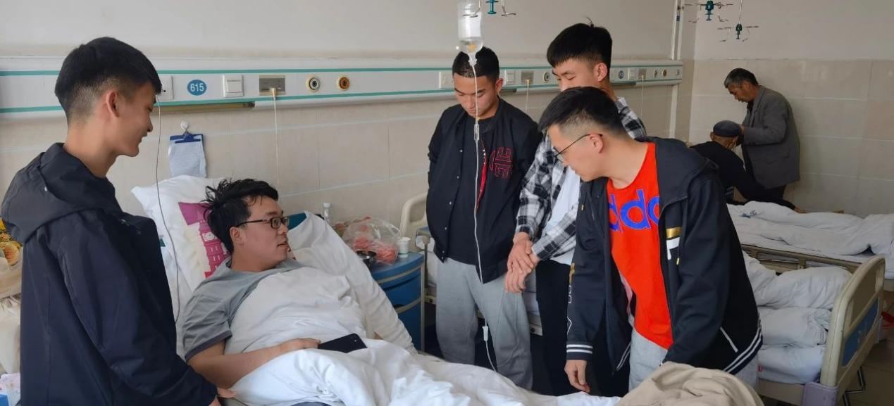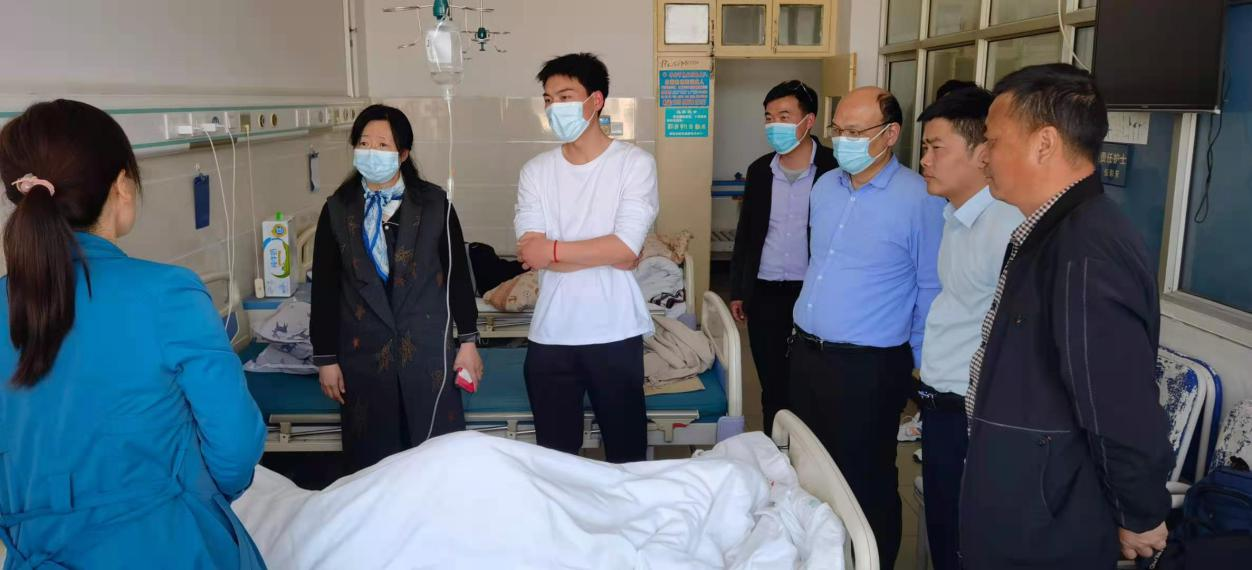 2021年4月17日,建筑工程公司党总支书记马春燕和经理张虎带领学工办主任刘高喜、宋春磊老师、员工代表何旭洋前往开封市中心医院看望生病员工张翔宇,代表全院全体师生送上真诚的祝福,祝他早日康复、回归校园。