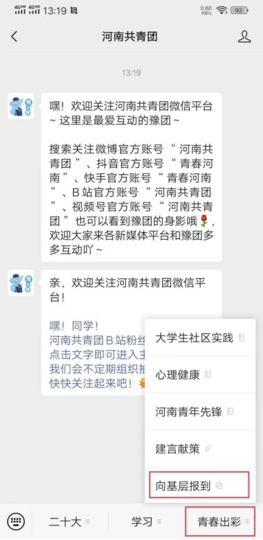 2. 报名方式:关注“河南共青团”微信公众号,点击“青春出彩”—“向基层报到”,或者直接搜索河南共青团老员工“向基层报到”微信小程序进行登录注册,具体操作如下:
