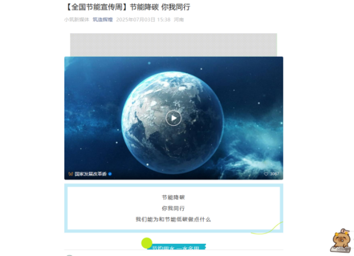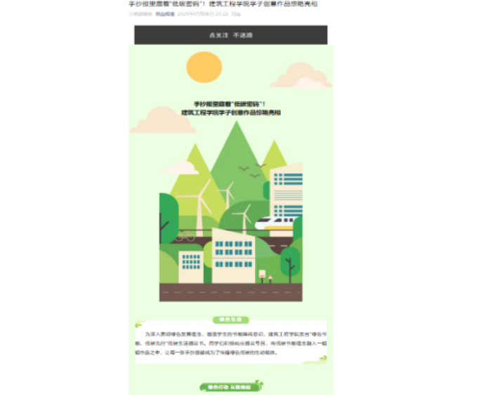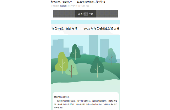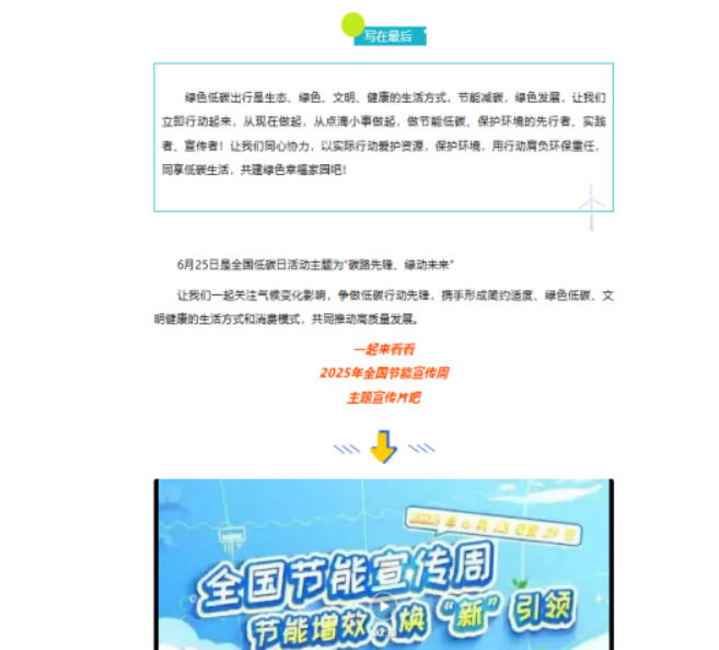 为全面深入贯彻习近平生态文明思想,完整、准确、全面贯彻新发展理念和党中央关于绿色低碳发展的战略部署,充分发挥政治引领作用,引导广大师生将低碳理念融入日常、转化为自觉行动。活动期间,公司以公众号“筑造辉煌”为核心传播载体,持续推送节能知识与低碳生活指南,聚焦“随手关灯、节约用电”“无纸化办公、减少耗材”“垃圾分类、资源循环”等实用技巧开展重点普及。通过常态化宣传引导与“节能低碳,你我同行”的倡议号召,推动全体师生从“被动遵守”转向“主动参与”,为践行“双碳”目标凝聚起公司的集体力量。